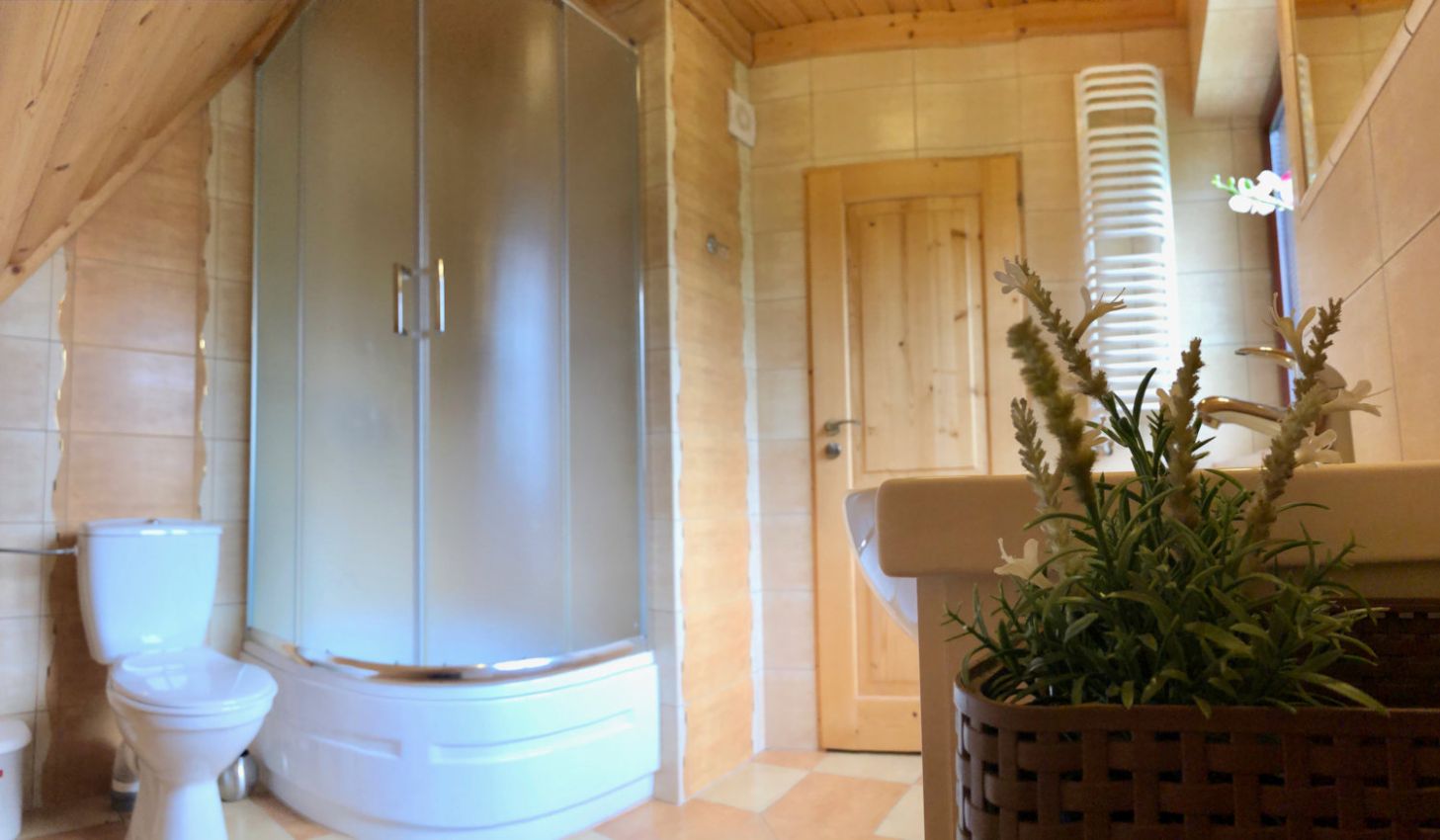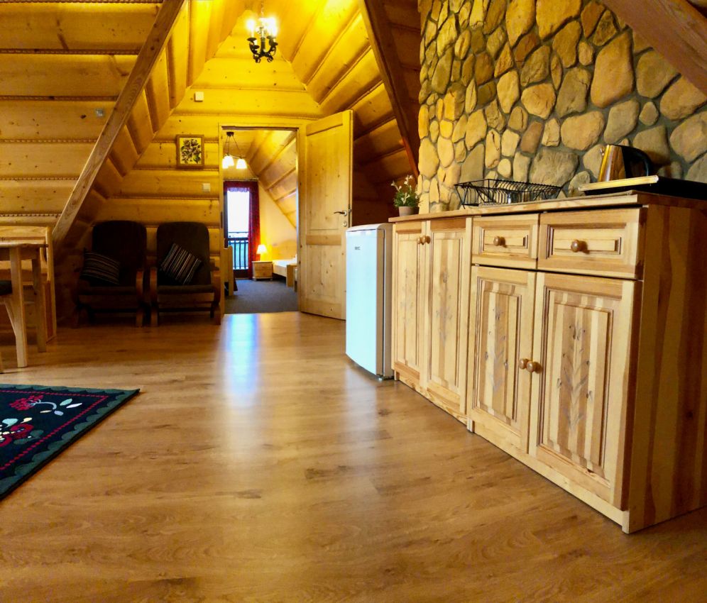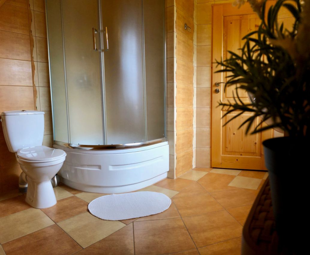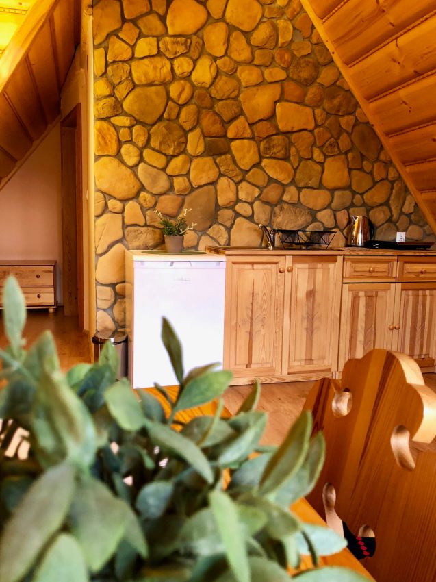 łazienka z prysznicem, kuchnia (czajnik, kuchenka, lodówka, naczynia)